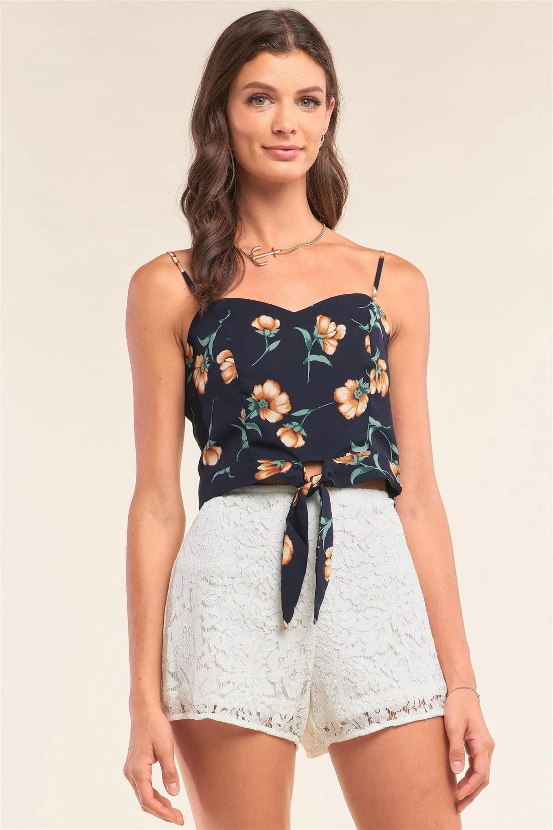 Dark Navy Multicolor Floral Print Heart-Neck Self-Tie Spaghetti Strap Cami Crop Top