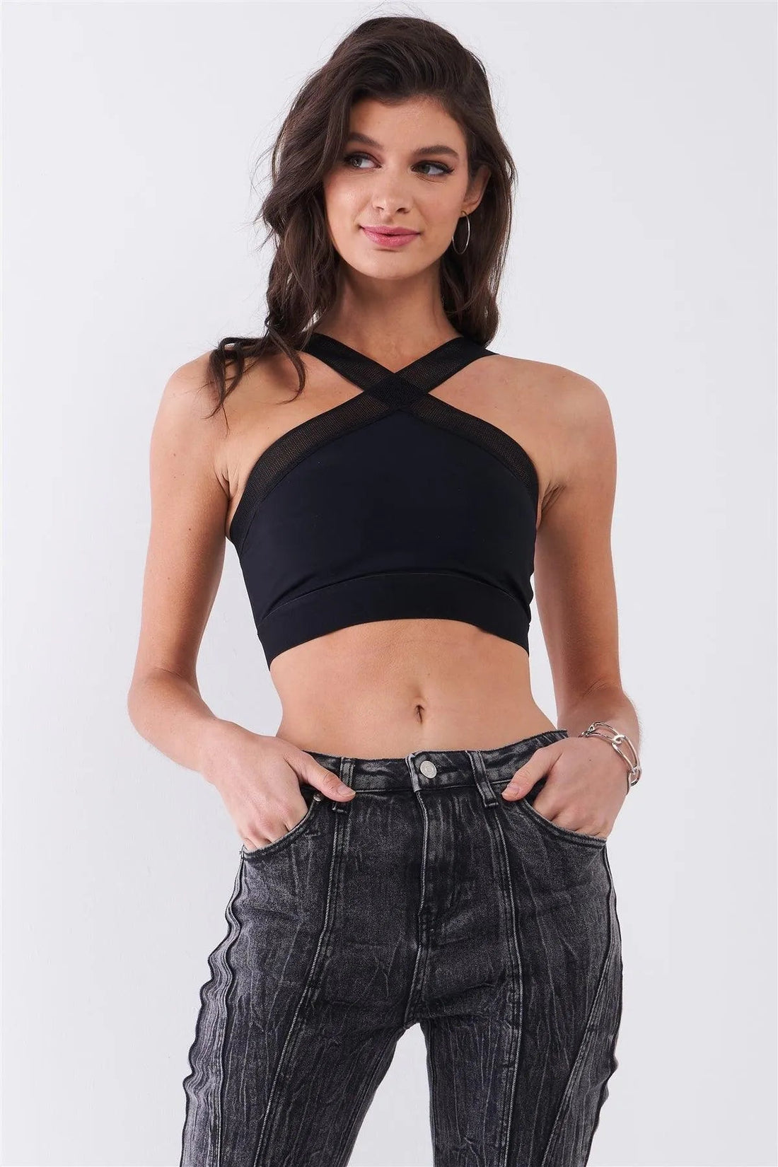 Black Sheer Net Halter Neck Tie Strap Cami Crop Top
