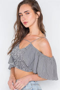 Top features: smocked, cami straps that tie in the back, off-the shoulder flounce sleeves, stripe print allover, crop lengthModel is 5'9 wearing a size Small ( Waist: 24", Bust: 32A, Hips: 34")Size Small Item Measurements: Length: 14" Bust: 34", Sleeves: 7"True to sizeAvailable in Blue