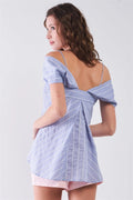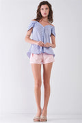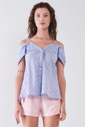 Light Blue Striped V-Neck Off-Shoulder Button-Down Cami Top