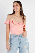 Pink Asymmetric Ruffle Trim Off-Shoulder Bodysuit